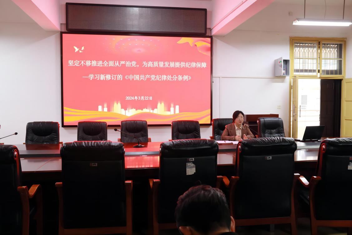 随后,我院党总支书记何志红与全体党员干部一同学习研讨了新修订的《中国共产党纪律处分条例》(简称《条例》)。何志红同志从“条例为何再次修订、此次修订有哪些突出特点、将对推动全面从严治党向纵深发展起到什么作用”等三个方面对《条例》进行解读,并指出新修《条例》传递了三点信息:一、聚焦重点、难点问题,坚决纠治形式主义、官僚主义;二、严守思想防线,以严明的纪律推进党的自我革命;三、坚持以严的基调全面加强党的纪律建设。