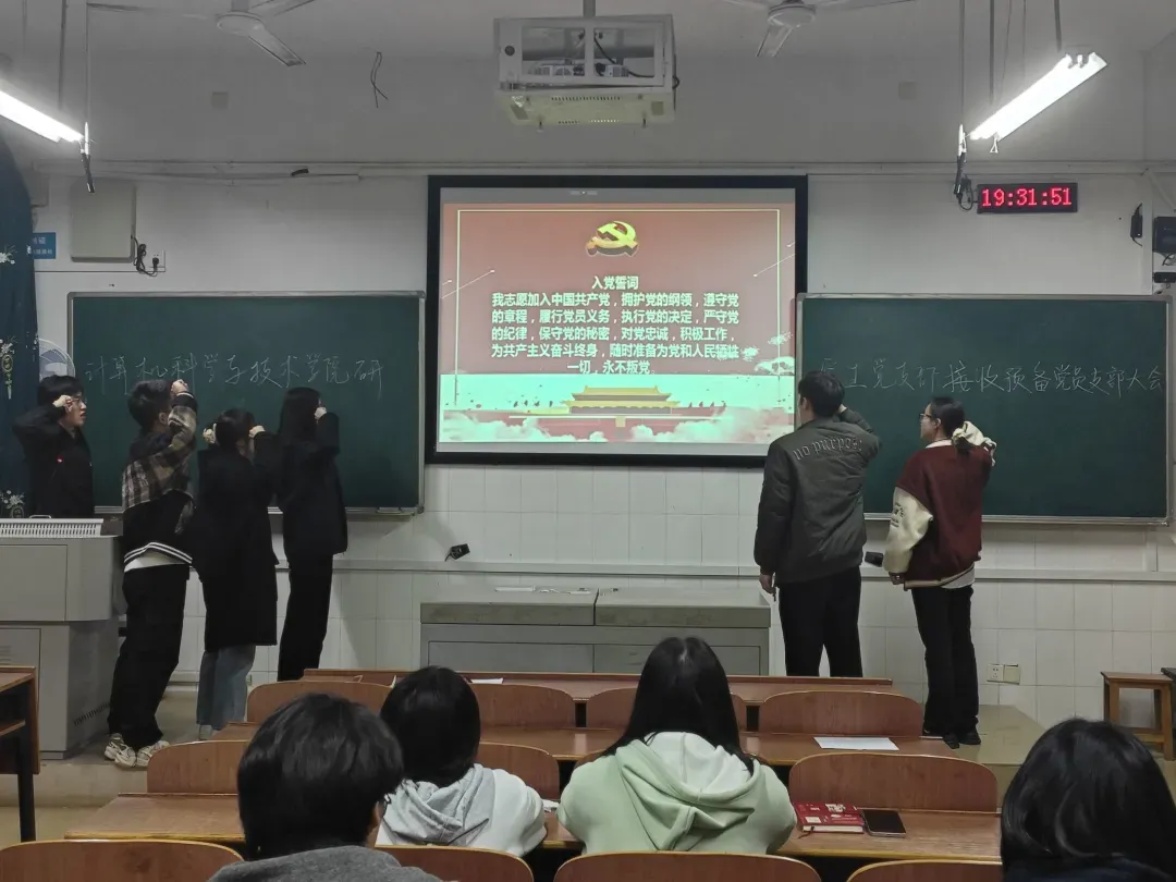 会议最后,卜嘉怡同志带领新发展的党员进行入党宣誓。党员们面向党旗,举起右拳庄严宣誓,铿锵有力的誓言表达了他们为党的事业不懈奋斗、终身奉献的坚定决心。党员同志们将铭记宣誓的神圣时刻,坚守党的信仰,积极学习党的理论,投身社会实践,锤炼党性修养,以实际行动践行党的宗旨,将誓词内化于心、外化于行,争取更大的进步。