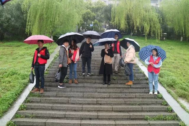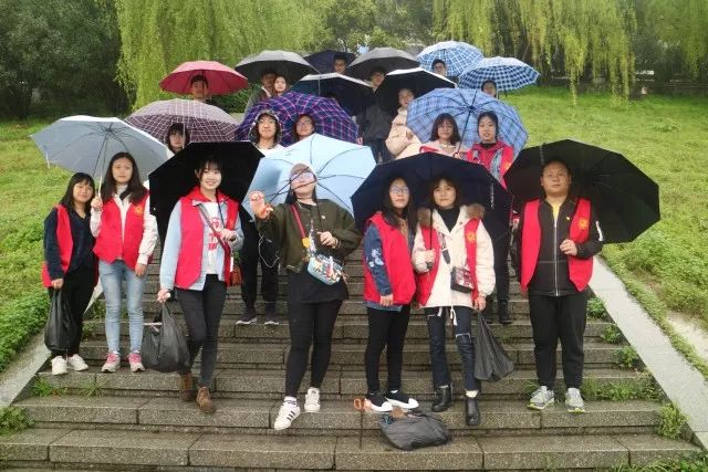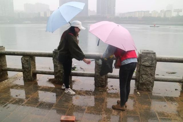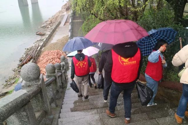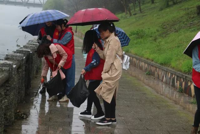 上午9点多,天还下着小雨,全体学生党员身穿红马甲,手持钳子、垃圾袋,两两一小组沿着江边的人行道拾捡江边的纸巾、果皮、烟头、食品袋等垃圾