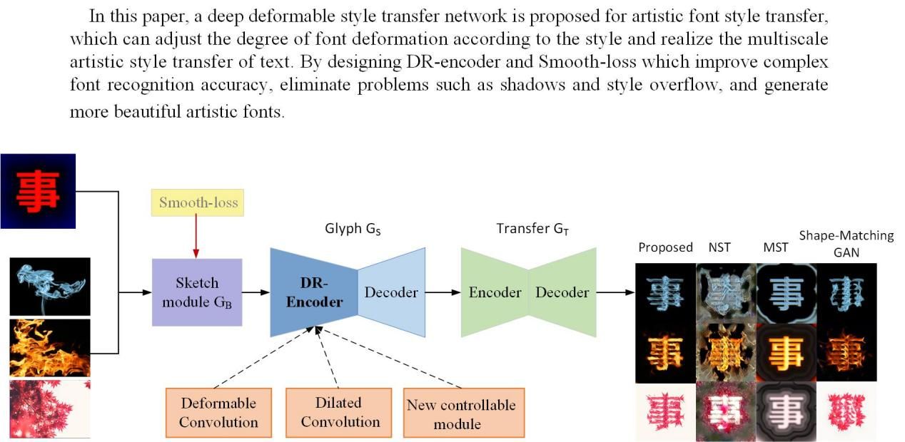 该论文是在我校林睦纲副教授的指导下完成,伟德国际victor1946为唯一署名单位。论文核心理论是:字体样式转移的本质是在保持字体字形结构的同时,将图像的样式特征转移到字体中。目前,基于卷积神经网络的生成对抗网络在字体样式生成中发挥着重要作用。然而,传统的卷积神经网络识别字体图像存在对未知图像变化适应性差、泛化能力弱、纹理特征提取能力差等问题。当字形结构非常复杂时,复杂字体图像无法有效识别。本文提出了一种用于艺术字体风格转移的深度可变形风格迁移网络,该网络可以根据风格调整字体的变形程度,实现文本的多尺度艺术风格转移。该模型包括用于学习字形映射的草图模块、用于学习风格特征的字形模块和用于融合风格纹理的迁移模块。在字形模块中,设计了Deform-Resblock编码器来提取字形特征,其中引入了可变形卷积,改变残差模块的大小,实现了不同尺度特征信息的融合,更好地保留了字体结构,增强了文本变形的可控性。因此,我们的网络对文字的控制能力更强,对图像特征信息的处理能力更强,能够产生更加精美的艺术字体。