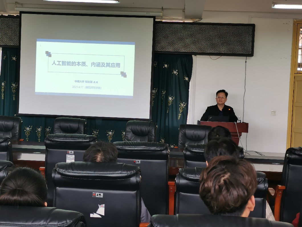 2021年4月17日下午16:00,在我院三楼报告厅,中南大学邹北骥教授应邀为我院师生开展了一场题为“人工智能的本质、内涵及其应用”的学术报告。报告由赵辉煌副院长主持,伟德国际1946院长李浪教授,副院长陈坚祯教授、郑光勇副教授和部分师生聆听了本次报告。