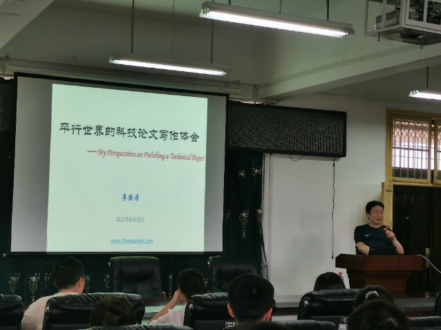 报告中,李教授系统且全面地讲解了科技论文的结构层次,以及撰写科技论文各个部分的方法与技巧,其中不仅涉及标题,摘要,关键字,总结,参考文献等内容,更是细致地分析了公式、图及它们的排版,论文用词等细节的撰写方法。并结合自身多年科研工作的历程,为在场师生分享了宝贵的经验。
