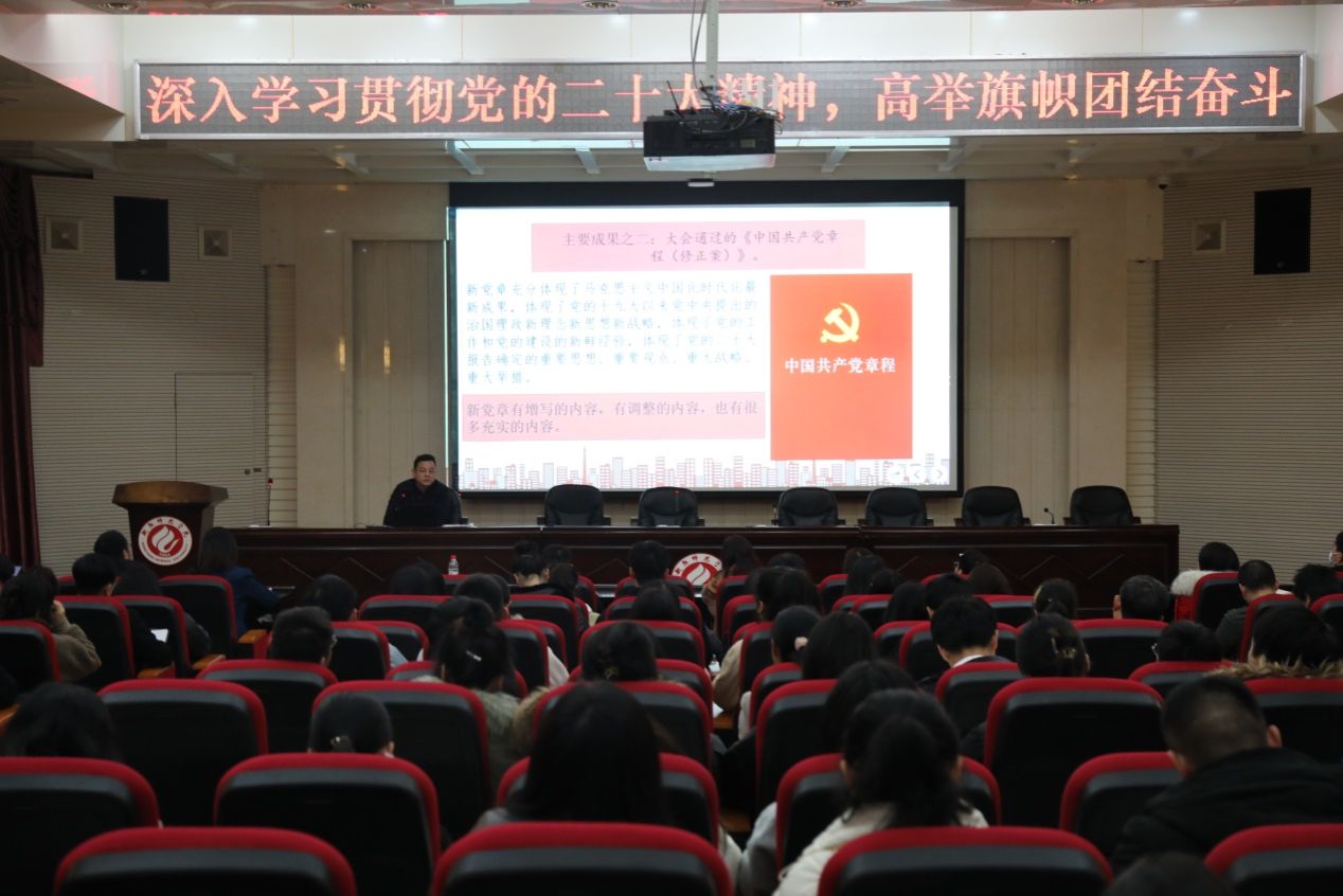 魏晓林以“高举旗帜,团结奋进——深入贯彻党的二十大精神”为题,从“全面领会党的二十大的主题及主要成果”、“深刻认识新时代十年的伟大变革及其里程碑意义”、“不断开辟马克思主义中国化时代化新境界”、“牢牢把握中国式现代化的中国特色和本质要求”、“全面建设社会主义现代国家的目标任务”、“坚持党的全面领导和全面从严治党”、以及“应对风险挑战和团结奋斗的精神状态”等七个方面,深刻阐述了党的二十大主题、主要成果、重大意义和二十大精神的核心要义,解读了党中央实施科教兴国战略和推进教育、科技、人才“三位一体”的重大部署,总结了学校在新时代十年取得的非凡成绩,回顾了衡师光辉的百年红色校史,并阐述了当前和今后一个时期学校的目标任务。他结合学校发展实际,号召广大党员同志以党的二十大精神为指引,坚守立德树人初心使命,把爱党爱国之情化为团结奋斗的力量,着力办好人民满意的教育,加快将学校建设成为特色鲜明的高水平师范大学。