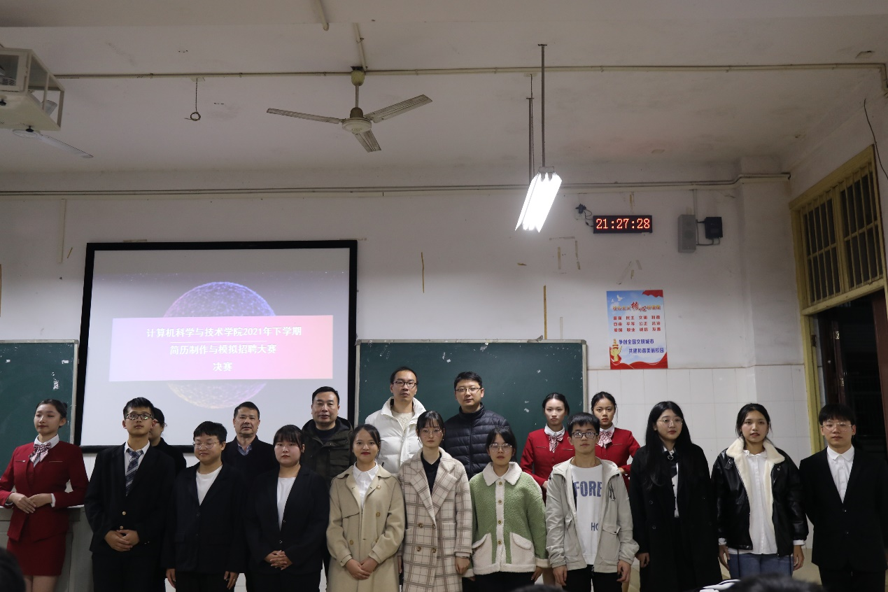 为加深我院学生对择业就业的正确认识,进一步加强就业指导力度,帮助学生全方位了解招聘的相关知识、技巧,模拟体验现场求职的气氛,不断增强就业实力。我院于11月11日晚在计科楼118教室举办 “前程无忧,勇往‘职’前”简历制作与模拟招聘大赛决赛。院总支书记陈洪清、总支副书记彭正、分团委书记马杰老师、辅导员徐峰老师、罗旭月老师担任此次决赛评委。