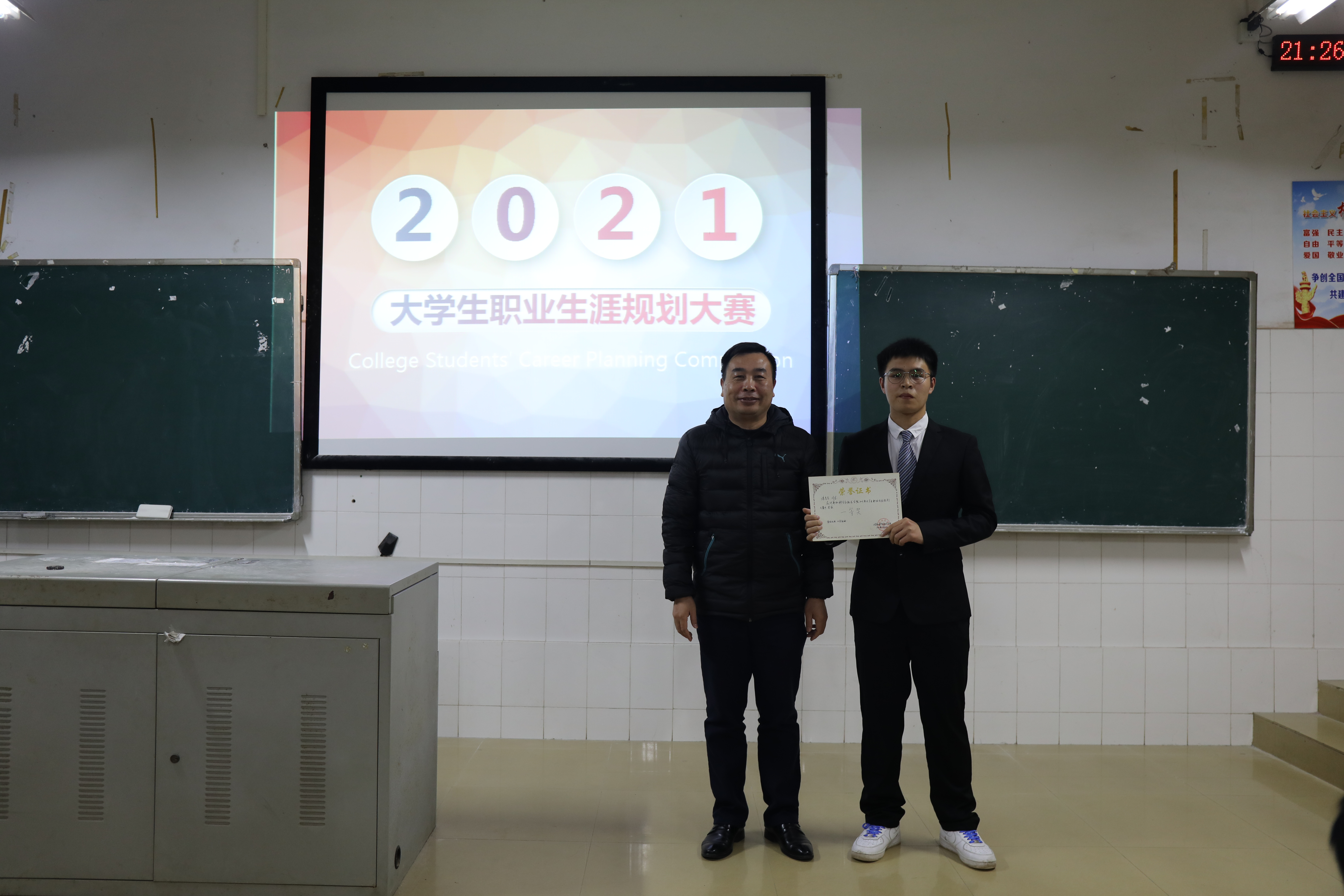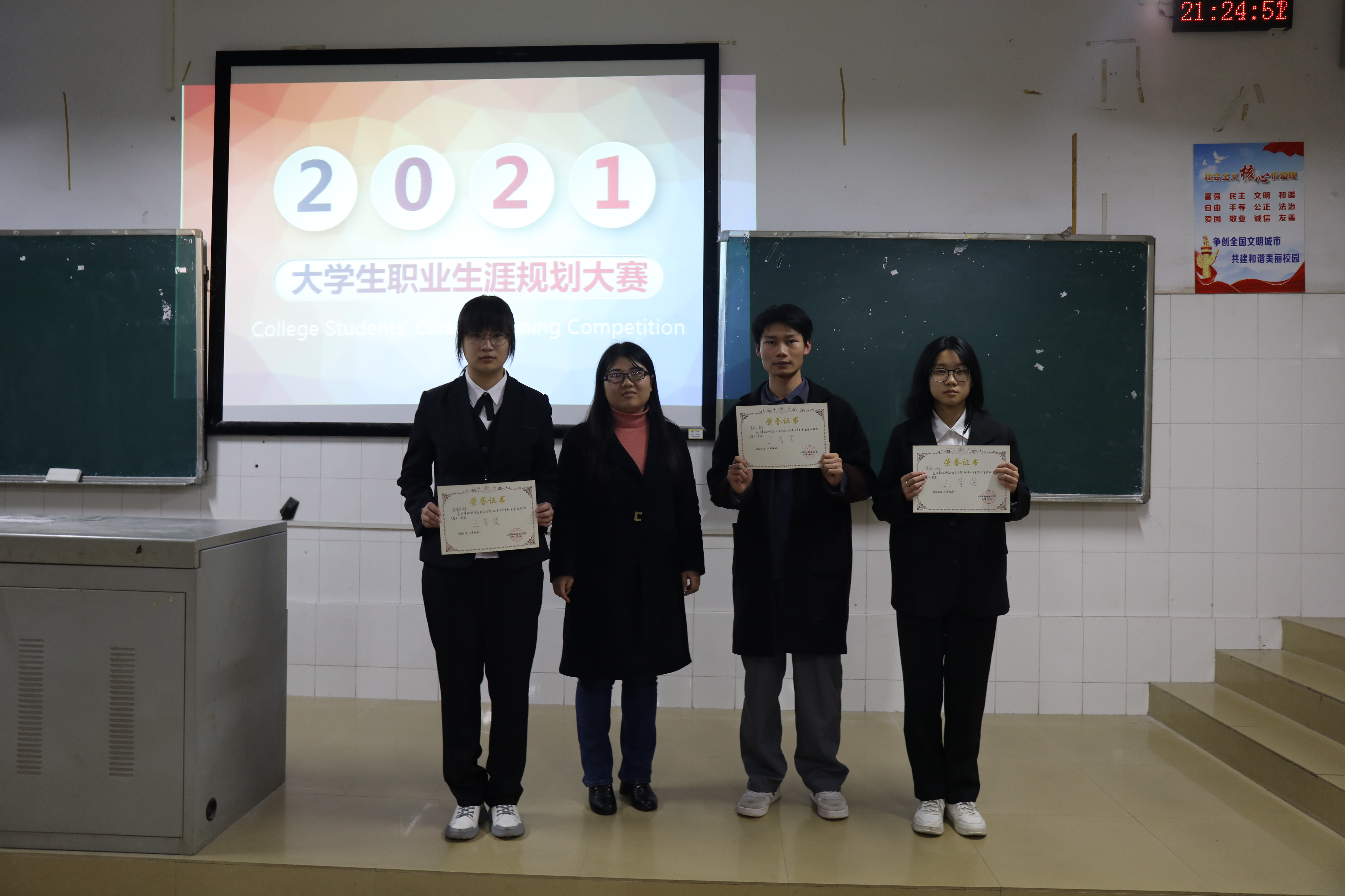 为帮助我院新生尽早树立职业生涯规划意识,明确自己的人生目标,发掘自身的潜能,从观念、心态、知识、技能等方面做好应对职业挑战的全面准备。我院于11月21日晚在计科楼118教室成功举办“规划精彩人生,打造锦绣前程”2021年大学生职业生涯规划大赛。我院总支书记陈洪清、总支副书记彭正、分团委书记马杰老师、辅导员徐峰、罗旭月老师应邀出席并担任此次比赛评委。