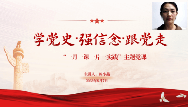 随后,党课以伟大建党精神、延安精神为核心,阐述了中国共产党在革命征程中,始终坚持解放思想、实事求是的目标,创造了百年辉煌。同时,陈小燕老师鼓励党员同志们要理解、掌握党的精神内涵,不断提高党员自省、自警、自励,增强自身的政治理论素质和党性修养。