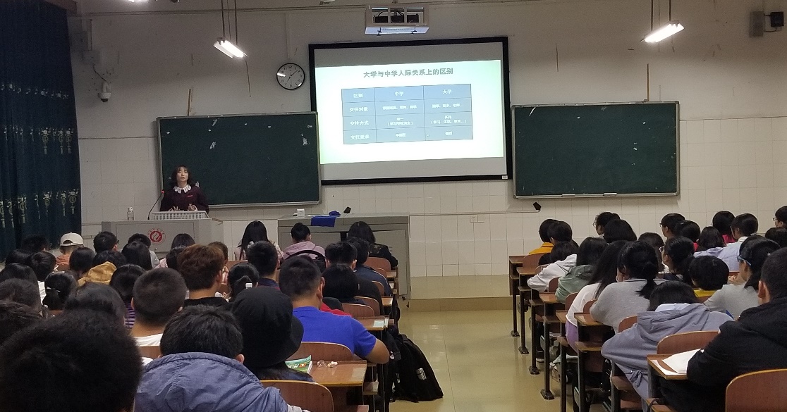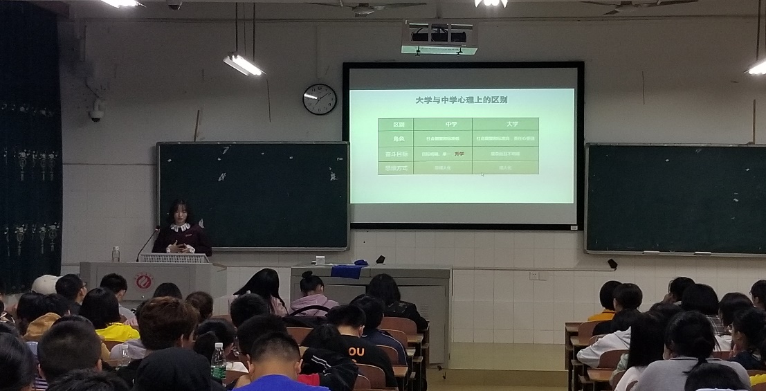 2018年10月25日下午我院辅导员谢媛老师为同学们开展心理适应讲座。谢媛老师讲大一新生刚入大学普遍存在的心理落差,紧接着老师强调了时间的重要性以及大学思潮的问题,再是几个简单的趣味心理测试,最后老师跟我们分享了一些关于心理方面的电影和电视剧,书籍以及很多富有哲理的名言警句。