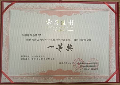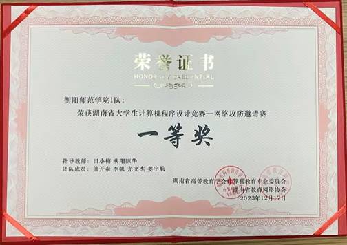 伟德国际1946共派出了5支参赛队伍共20名队员参加了此次比赛。来自国防科技大学、湖南农业大学等高校的14支参赛队获得本届网络攻防大赛一等奖,其中由田小梅老师指导的伟德国际victor1946玄天网安CTF实验室代表队斩获一等奖三项。