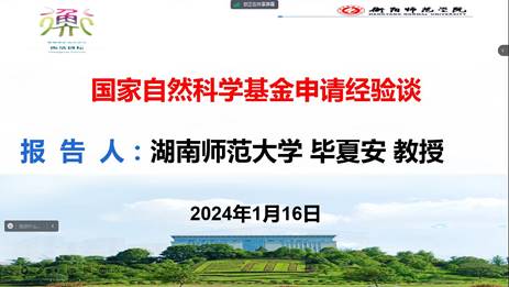 为帮助学院教师提高国家自然科学基金项目的申请质量,2024年1月16日20:00,学院召开了2024年度国家自然科学基金项目申报指导交流会。本次会议使用腾讯会议线上召开,湖南师范大学毕夏安教授应邀参加会议,会议由我院副院长焦铬教授主持,学院院长李浪教授、本次符合申报条件的老师、青年博士及部分研究生参加了此次会议。
