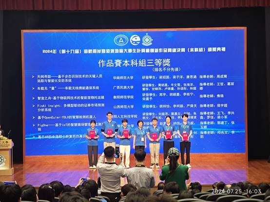2024年7月23-7月26日在澳门理工大学举办海峡两岸暨港澳地区大学生计算机创新作品赛(本科组)总决赛。本次比赛覆盖全国29个省(含港澳台)323所高校,共有1637个作品参赛。我院焦铬教授指导的学生宾宇、胡顺嘉、宋晨予、李桂宁的作品“智宠之舟-基于物联网技术的智能宠物托运箱统”获得全国三等奖。