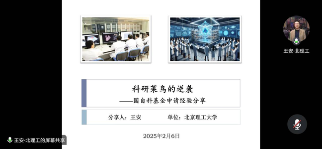 2025年2月6日20:00,我院召开2025年度国家自然科学基金申报辅导会,北京理工大学王安研究员应邀为我院教师作题为《科研菜鸟的逆袭 ——国自科基金申请经验分享》专题报告。报告会通过腾讯会议举行,由院长李浪教授主持,全体国家自然科学基金项目申报负责人及部分老师、研究生参加了此次会议。报告中,王研究员分享了申报书各部分的撰写经验,包括方向选择和总体目标,申报选题以及申报书的包装技巧等诸多方面,为与会人员提供了细致具体、切实可行的指导。报告会后,王研究员同与会人员就项目申报等相关内容,进行了更细致具体的讨论,并给出了切实的建议。
